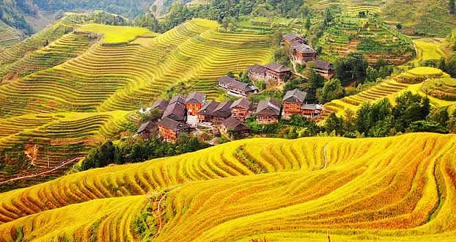 金坑大寨是龙胜规模最大的梯田,登上当地最高海拔1180米的西山韶乐观景点,俯瞰梯田美景